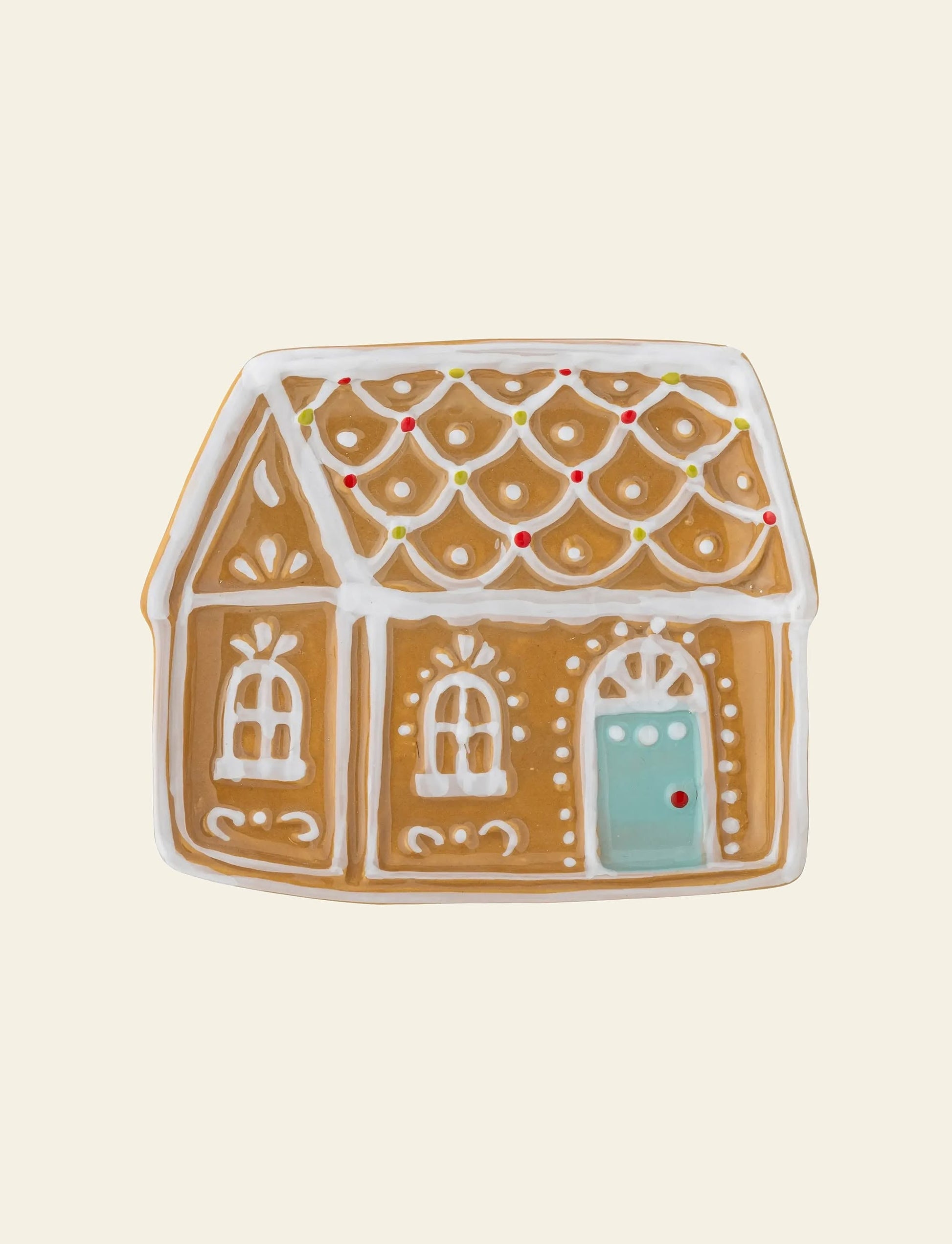 House Serving Plate - Brown – Bring festive cheer to your table with this adorable gingerbread house–shaped plate. Made from dolomite ceramic and decorated with icing-inspired details and colourful candy-dot accents, it’s perfect for serving Christmas cookies, snacks, or adding a cosy seasonal touch to your décor.